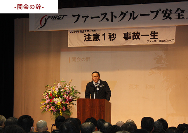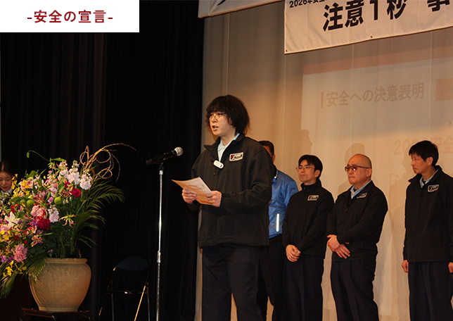 表彰式の後には、優秀ドライバーの代表者より今年度の安全への決意を込めて「安全の宣言」を行いました。現場の第一線で業務にあたる社員の言葉として、安全運転への決意と具体的な行動指針を全社で共有し、社員一人ひとりの意識向上を図る機会となりました。