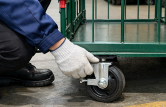 カートやカーゴを使用する場面では、作業前・作業後にロック確認し、意図せず自走しないよう安全確認を徹底しています。