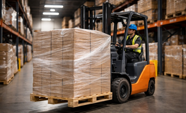 フォークリフト作業ではラップの使用により荷崩れを防ぐとともに、路面状況が悪い場所は可能な限り避け、周囲の安全を確保したうえで作業を進めています。