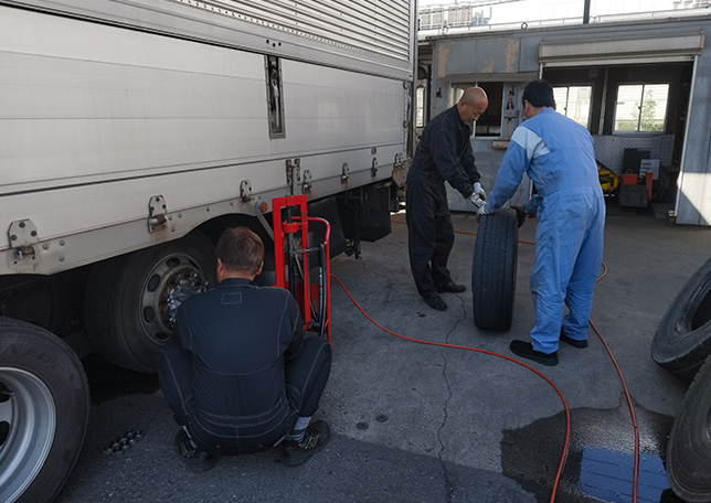 車両課のメンバーが中心となって、タイヤの状態確認から履き替え作業まで、丁寧かつ迅速に対応しています。
